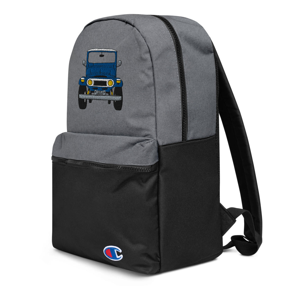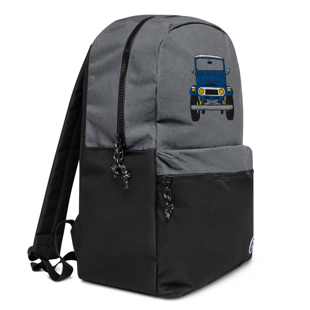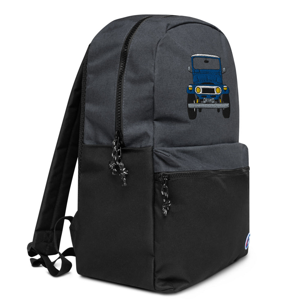 • Padded ergonomic polyester bag straps with plastic strap regulators and Champion brand label on the left strap